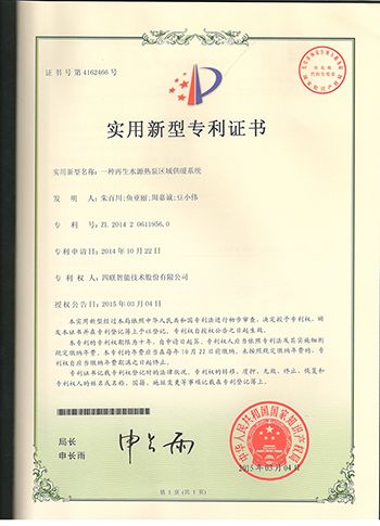 四联公司新申请的两项专利已正式通过国家知识产权局专利局审查,被授予实用新型专利权。这两项专利分别是《一种污水紊流池水位检测装置》,专利号:201420581705.2;《一种再生水源热泵区域供暖系统》,专利号:201420611956.0。这两项专利对科技成果转化应用,提高效率、提高质量起到了积极的探索意义。
