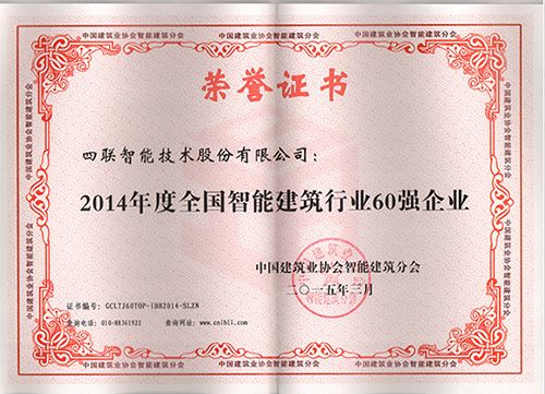 祝贺我公司荣膺“2014年度全国智能建筑行业十大品牌企业” 和“2014年度全国智能建筑行业60强企业”称号