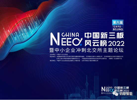 2022年12月9日,“第六届中国新三板年度风云榜2022暨中小企业冲刺北交所主题论坛”成功在京举办。会上公布了2022新三板风云榜及北交所投资者保护指数评选优秀榜单,四联智能技术股份有限公司(简称:四联智能,股票代码:430758)荣获“新三板治理性优质企业奖”,这是四联智能第三次获此殊荣。同时,四联智能董事会秘书惠红娟女士荣获“新三板企业金牌董秘”。