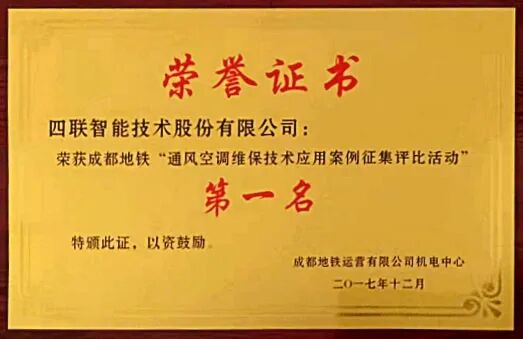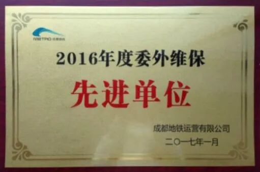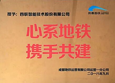 2018年1月四联智能荣获“成都地铁运营线施工管理先进单位”奖牌