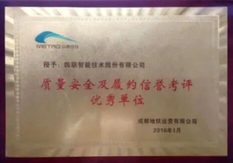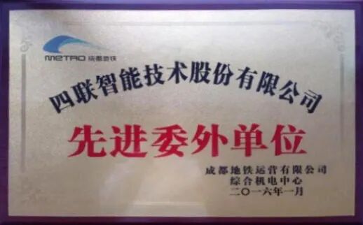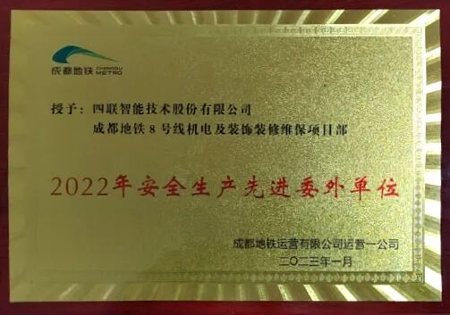 2023年1月,四联智能技术股份有限公司(简称:四联智能,股票代码:430758)成都地铁8号线机电及装饰装修维保项目部被成都地铁运营有限公司运营一公司授予“2022年安全生产先进委外单位”荣誉称号,特此祝贺。