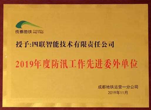 2019年11月四联智能荣获“防汛工作先进委外单位”奖牌